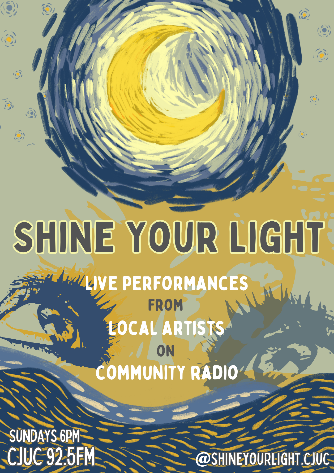 Shine Your Light is a live performance/interview radio production, Drawing inspiration from the artistic curiosity of the podcasts such On Being & Talk Easy. In the five seasons since its inception Shine Your Light has provided a platform for over 60 Yukon based musicians and artists, peel back the curtain on the creative process and held space for raw live performances.